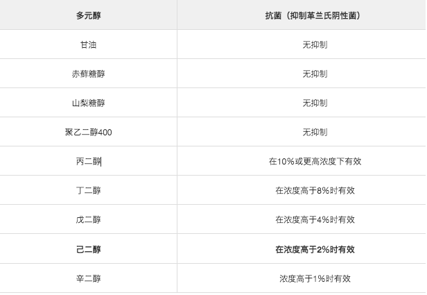 甘油和山梨糖醇无防腐效果,但是二醇例如丙二醇对革兰氏阴性细菌具有抗菌活性。(参考文献3:2006) 这些二醇的抗菌特性是由二元醇溶解自身的作用引起的,这些水分将其从微生物中带走,而微生物被认为无法生长或死亡。(文献3:2006)(* 2) ∗ 2为了使微生物生长,需要最少量的水,添加二元醇会降低微生物的水活度并抑制微生物的生长。