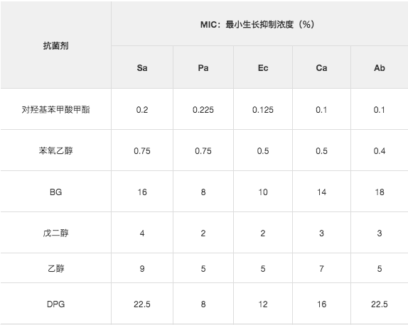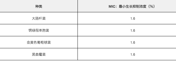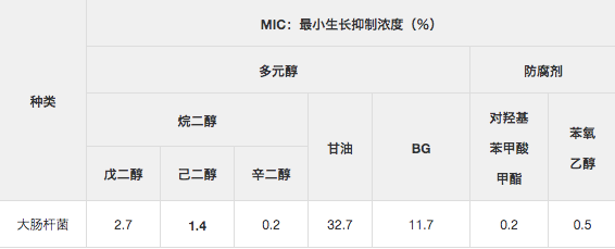 根据高级酒精行业在2006年公布的1,2-己二醇的MIC(最小抑菌浓度),为了研究1,2-己二醇对以下4种的抗菌活性,如下表所示MIC。(* 3) * 3由于MIC是最小抑菌浓度,因此数值越小,抗菌活性越高。